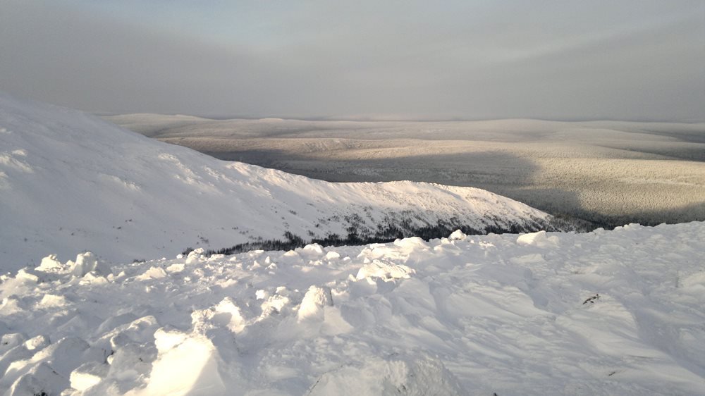 - Преодолев 67 километров (половина от запланированного маршрута) группа поднимается на хребет Ольвинский камень. Нижние склоны горы покрыты густым лесом. На снегоходах предстоит пробиться через тайгу на плечо горы, где заканчивается лес, и далее на вершину - порядка 1,5 км. По безлесному гребню к вершине, обозревая вокруг бескрайние просторы Северного Урала. Чем выше подъём, тем деревья становятся ниже и реже, ближе к вершине появляются каменные россыпи и скальные образования. По завершению подъёма на вершину - отдых, фотосессии, наслаждение панорамными видами горных хребтов и долин, предстающих взору с вершины: Буртым, Серебрянский камень и Конжак на юге; Сенной камень, Сосьвинский камень, Денежкин камень, виды на Главный Уральский хребет - на Северо-западе.