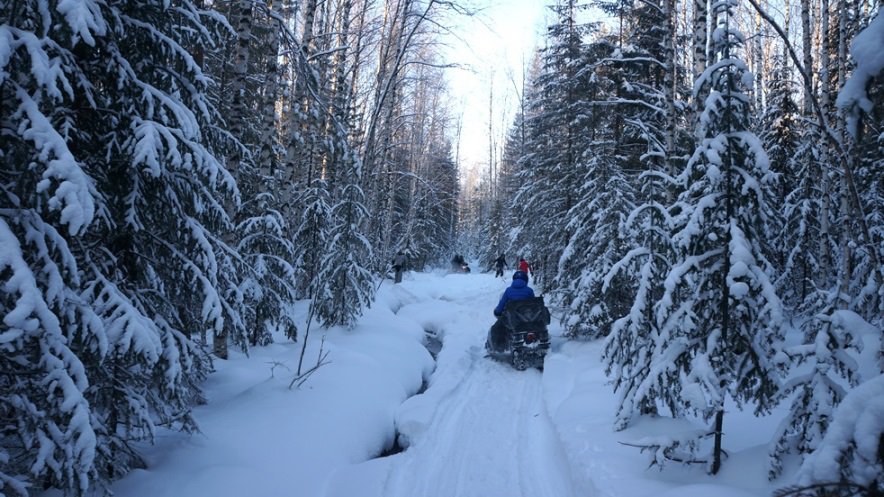 - 9:00 Заправка и подготовка снегоходов к выезду. Выезд с туристической базы "Серебрянский камень". В этот день предусмотрено продолжительное перемещение группы снегоходчиков по умеренно пересечённой местности через северную тайгу, а также подъём на снегоходах на одну из высоких горных хребтов Северного Урала.