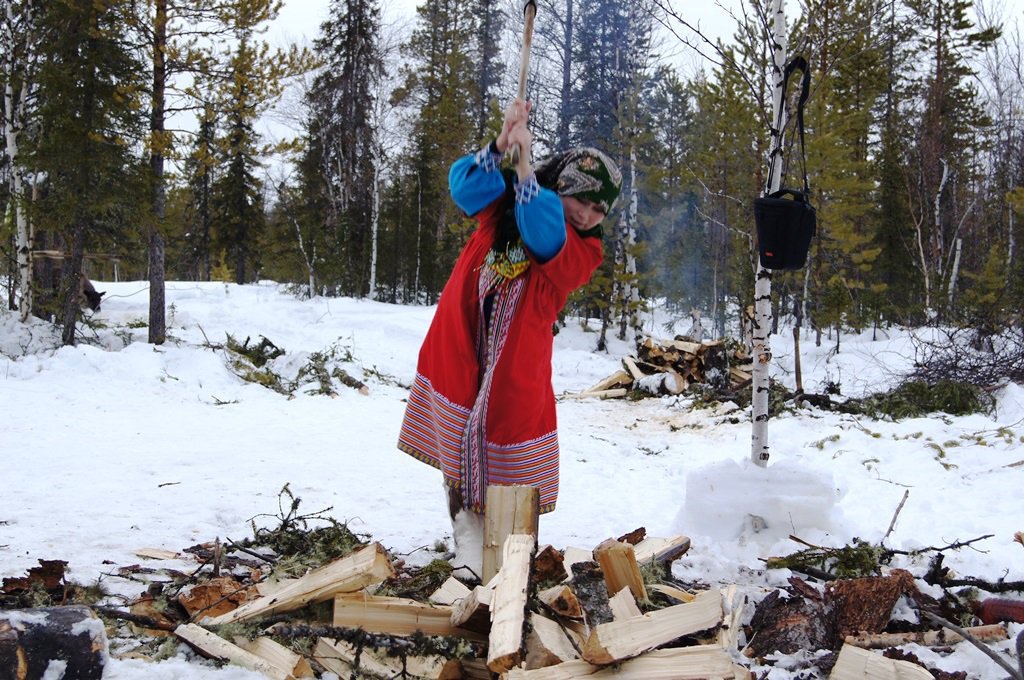 День. Посещение стойбища оленей для выбора жертвенного оленя. Обед в стойбище. Тренировка в метании маута на хорей. Ловля оленя арканом. Прогулка по лесу, знакомство с флорой и фауной лесотундры. Проводники ханты учат путешественников читать следы зверей на снегу.