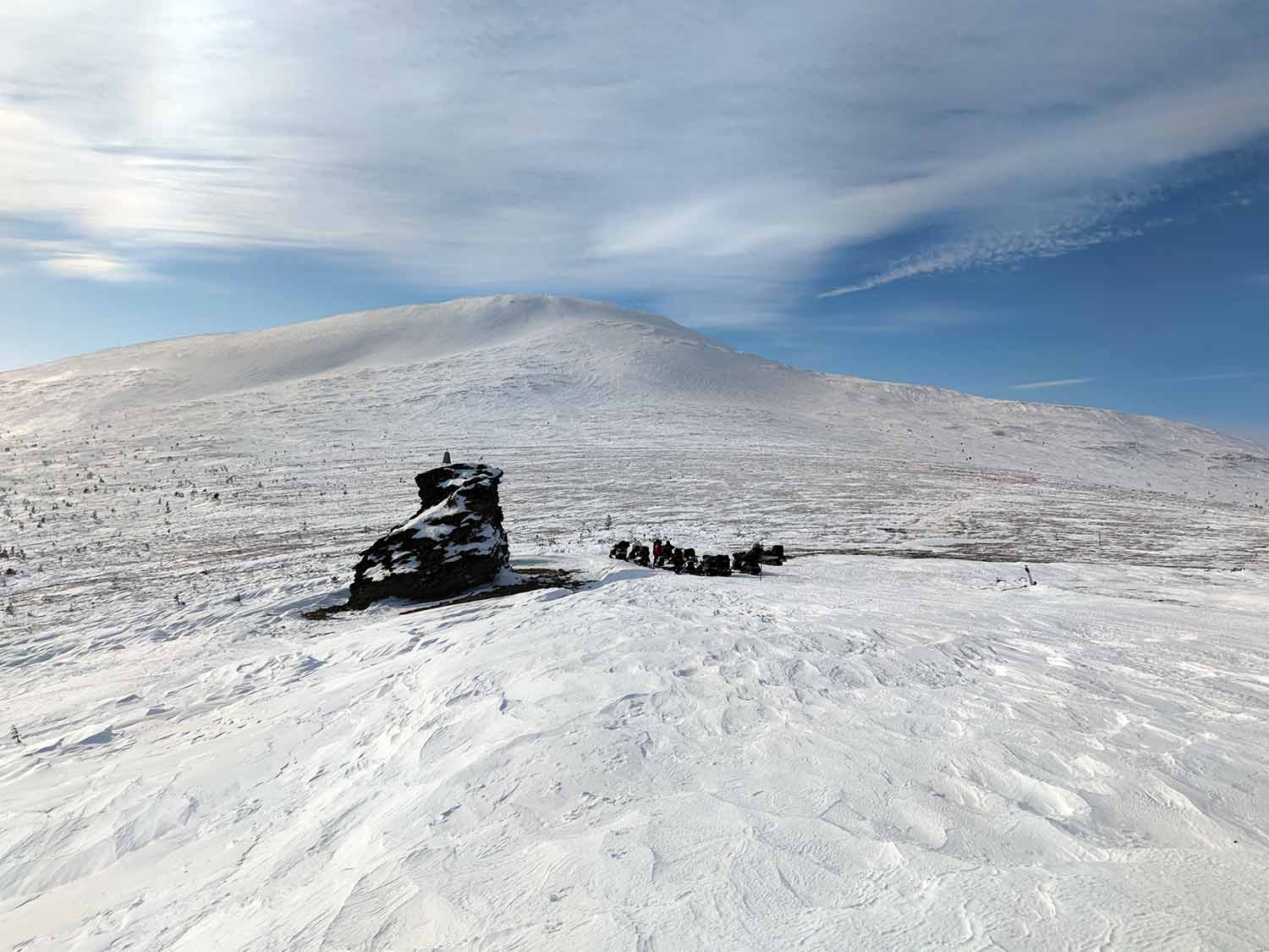 Затем по крутому затяжному подъему выскакиваем на горный гребень. Под снегоходами белая пустыня, вокруг таёжные дали. От видов захватывает дух.