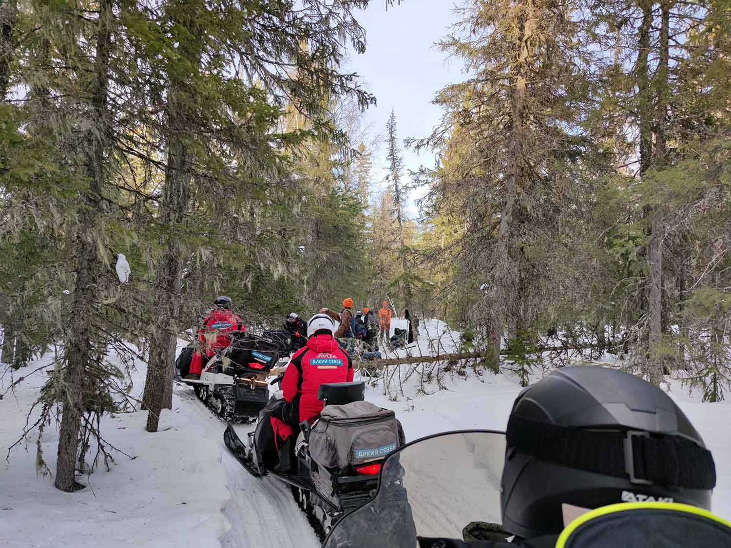Снегоходный путик проходит через тайгу, болота, озёра и реки.